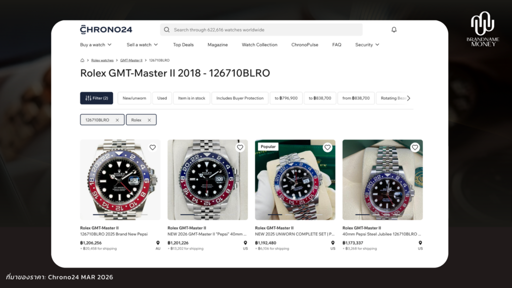 สิ่งที่ทำให้ข่าวลือนี้ยิ่งร้อนกว่าเดิม คือฝั่ง Grey Market เริ่มตอบสนองเร็วมาก เพราะในตลาดรองของไทยและต่างประเทศ ตอนนี้มีประกาศขาย 126710BLRO หลายเรือนที่ทะลุ 1 ล้านบาท ไปแล้ว บาง listing บน Chrono24 ไทย แตะราว 1.10–1.16 ล้านบาท ขณะที่ร้านรีเซลบางแห่งในไทยก็เริ่มตั้งราคาใกล้โซนเดียวกันแล้ว