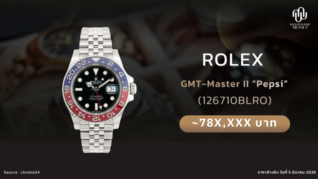 GMT-Master II ขอบแดง-น้ำเงิน หรือที่เรียกว่า Pepsi เป็นหนึ่งใน Rolex ที่มีดีมานด์สูงมากในตลาด ราคาตลาดรีเซลอยู่ประมาณ 700,000 – 800,000 บาท